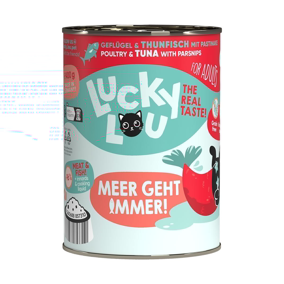 Lahodn� krmivo v�konzerv? pro dosp?l� ko?ky zna?ky Lucky Lou s�lahodnou dr?be�� a tu?�kem. Pr�miov� kvalita s�vysok�m pod�lem masa a bez p?�davku obilovin a cukru.