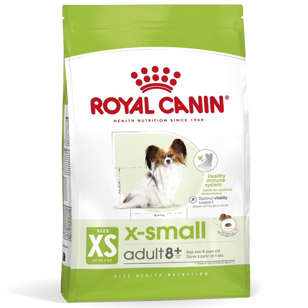 • Royal Canin X-Small Adult 8+ – krmivo určené pro starší psy malých plemen (od 8 let), vhodné pro cílenou výživu v seniorském věku
