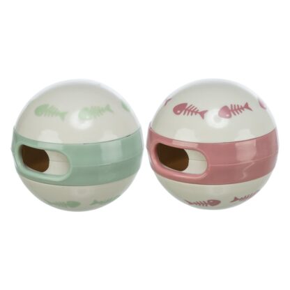 Barevný míček s nastavitelným otvorem pro naplnění pamlsky. Povzbuzuje kočky ke hře a rozvíjí jejich šikovnost.