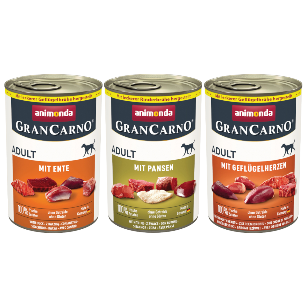 Výhodné balení animonda GranCarno Original je praktická volba pro všechny, kteří chtějí mít po ruce kvalitní krmivo pro psa v oblíbené řadě GranCarno Original. Tato sada obsahuje 24 konzerv s obsahem 400 g (celkem 24 × 400 g) v mixu 2 až 3 druhů, takže krmení zůstává pestré a snadno se plánuje do budoucna.
