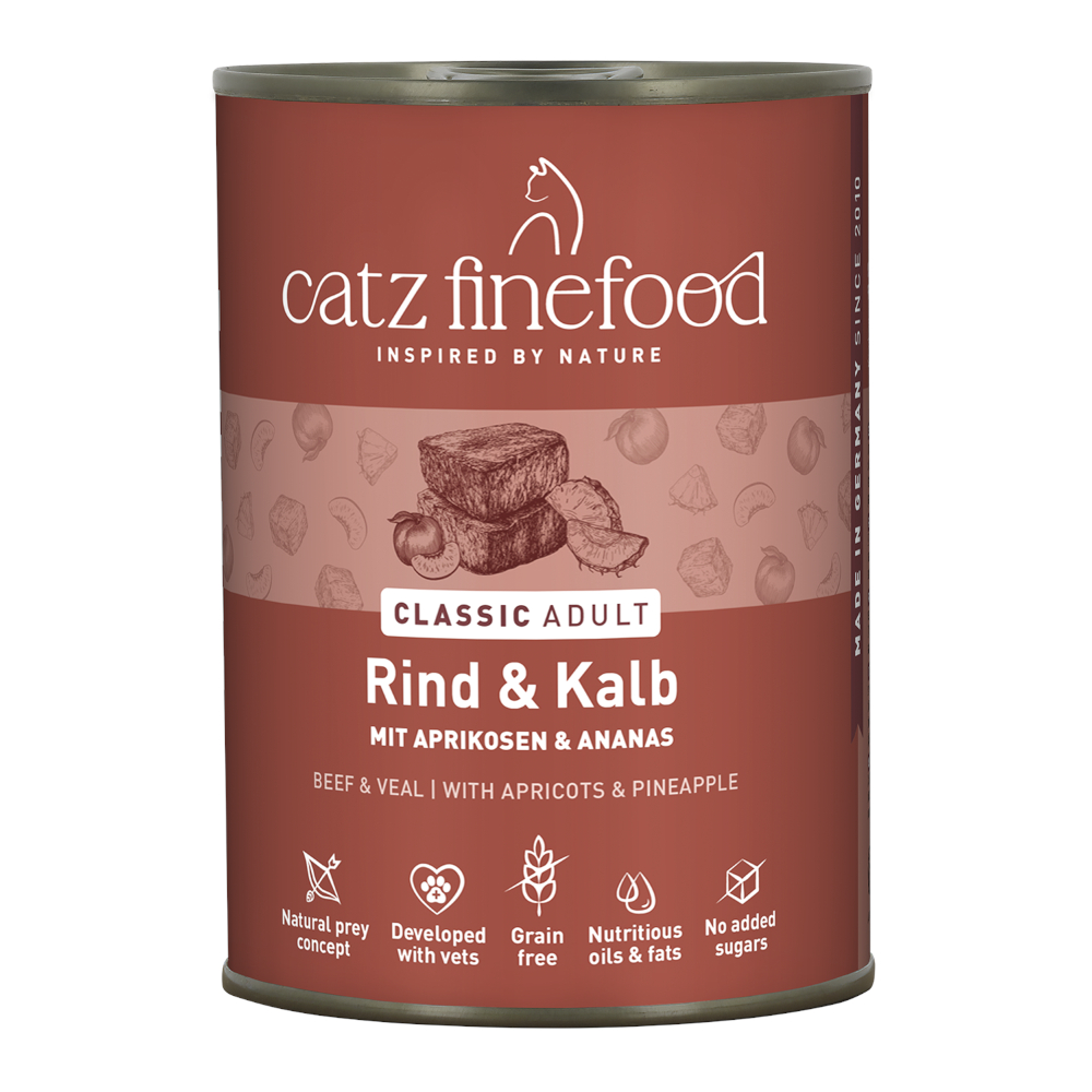 Objednejte si výhodné balení catz finefood 12 × 400 g – hovězí & telecí a dopřejte své kočce oblíbenou masovou pochoutku s pohodlnou zásobou do dalšího krmení.