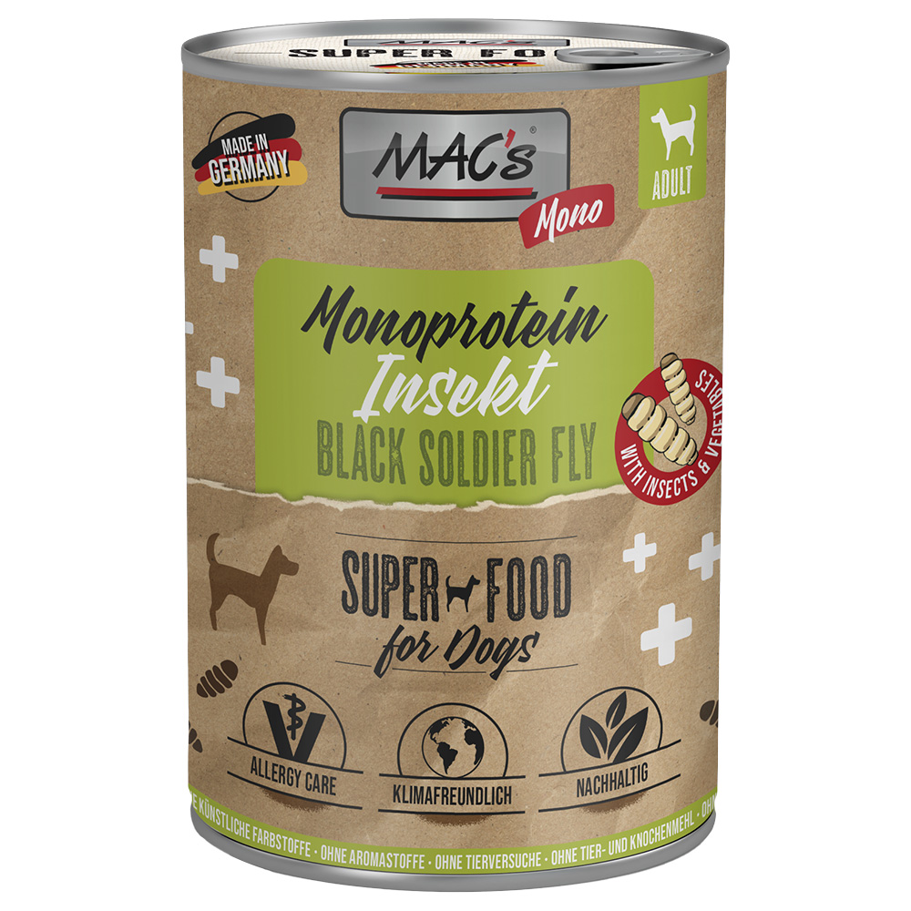 Objednejte MAC’s Mono Insect vlhké krmivo pro psy v balení 24 ks (24 x 375 g) a dopřejte svému psovi krmivo s hmyzím zaměřením – stačí vybrat množství a vložit do košíku.